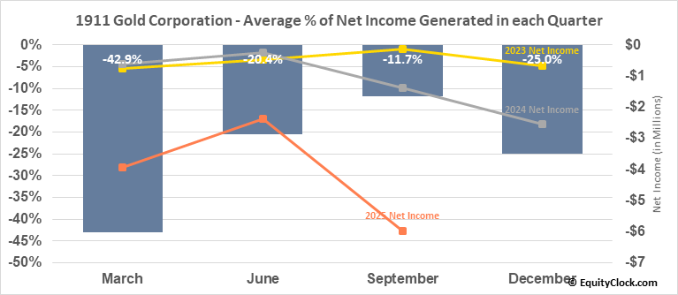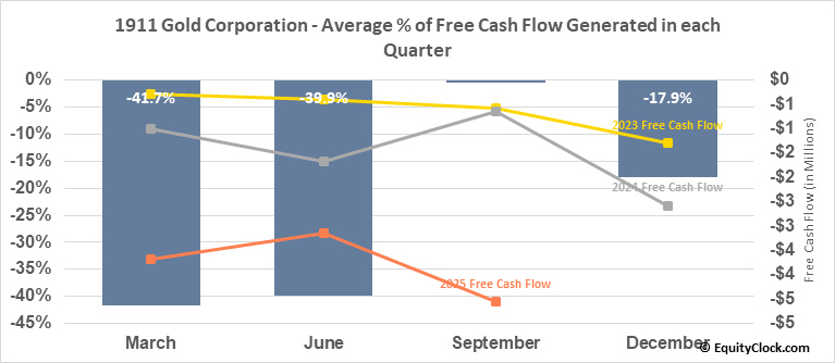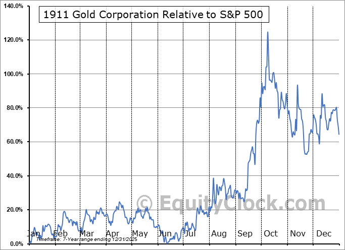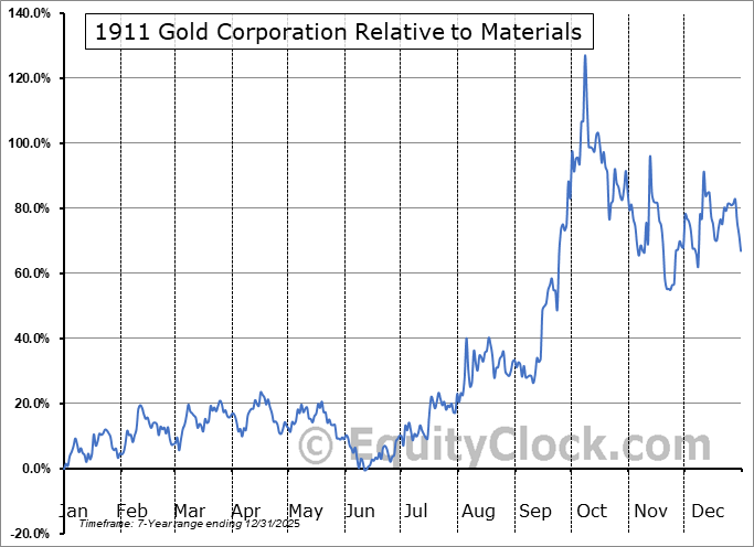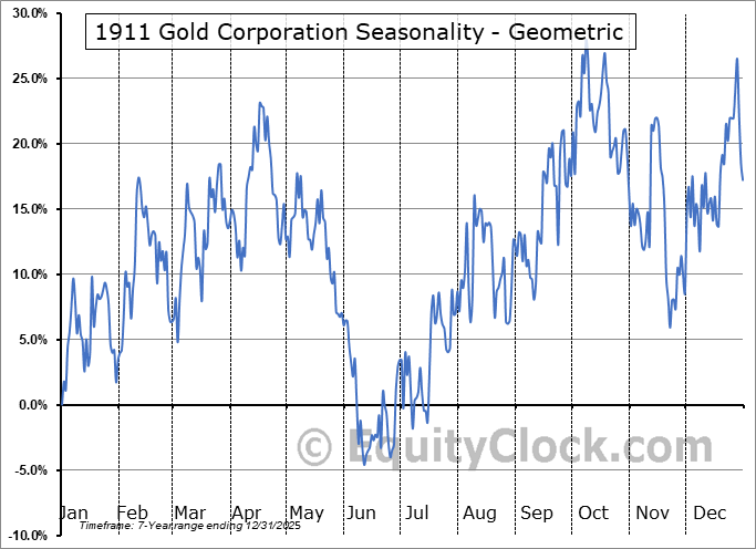 Analysis of the 1911 Gold Corporation (TSXV:AUMB.V) seasonal charts above shows that a Buy Date of November 29 and a Sell Date of March 10 has resulted in a geometric average return of 23.41% above the benchmark rate of the S&P 500 Total Return Index over the past 7 years. This seasonal timeframe has shown positive results compared to the benchmark in 7 of those periods. This is an excellent rate of success and the return strongly outperforms the relative buy-and-hold performance of the stock over the past 7 years by an average of 24.22% per year.