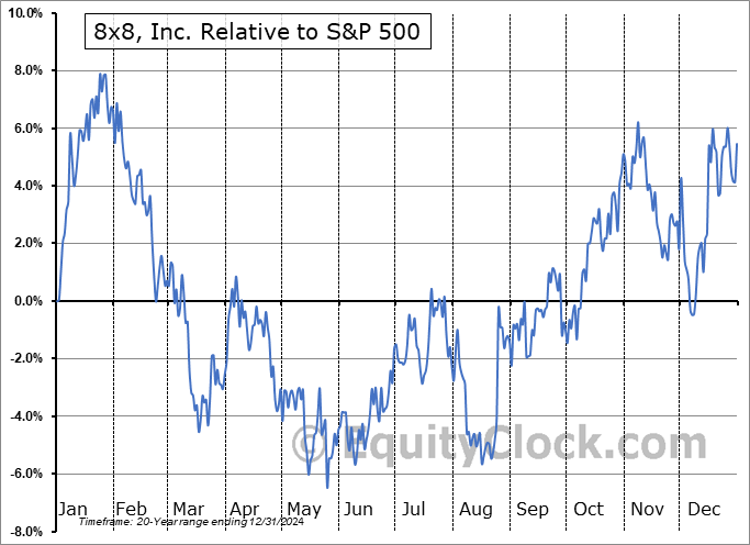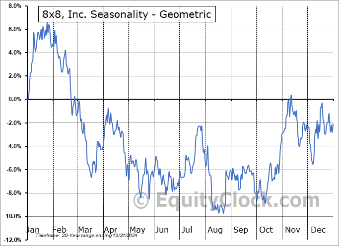 Analysis of the 8×8, Inc. (NASD:EGHT) seasonal charts above shows that a Buy Date of August 23 and a Sell Date of January 19 has resulted in a geometric average return of 12.93% above the benchmark rate of the S&P 500 Total Return Index over the past 20 years. This seasonal timeframe has shown positive results compared to the benchmark in 15 of those periods. This is a good rate of success and the return strongly outperforms the relative buy-and-hold performance of the stock over the past 20 years by an average of 24.02% per year.