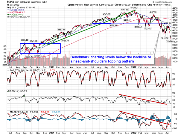 Stocks snapped back from recent losses as investors digested the latest FOMC rate decision. The S&P 500 Index jumped by 1.46%, charting a rather indecisive doji candlestick with long upper and lower wicks. The benchmark continues to hold declining trendline support, now around 3725, as a short-term consolidation pattern becomes apparent. The downside gaps charted in recent days between 3975 and 4020, followed by Friday’s downside gap between 3840 and 3900, present logical hurdles to cap any rebound attempt in the near-term. As we enter the mean-reversion period for the market and the start of the average summer rally period, we would like to see how the reaction to these zones plays out before deploying our cash hoard back into risk (stocks). Momentum indicators are still showing characteristics of a bearish trend and major moving averages are all pointing lower, defining negative trends over multiple timeframes. Over the next couple of weeks, traders are encouraged to be on the lookout for some sizeable swings in the market as portfolio managers rebalance their books. While we would like to stick our nose out now to increase our risk exposure, the threatening setup presented by the three black crows pattern on the chart of the S&P 500 Index is enough to give us caution and force us to wait for the weight of the evidence to materialize to suggest that an upside rebound from current levels is more likely than not. We remain in this traders market and that is precisely what we continue to do.
