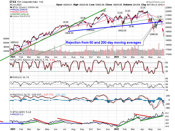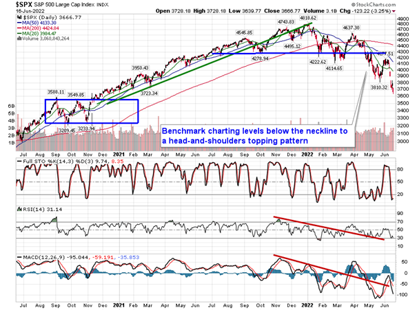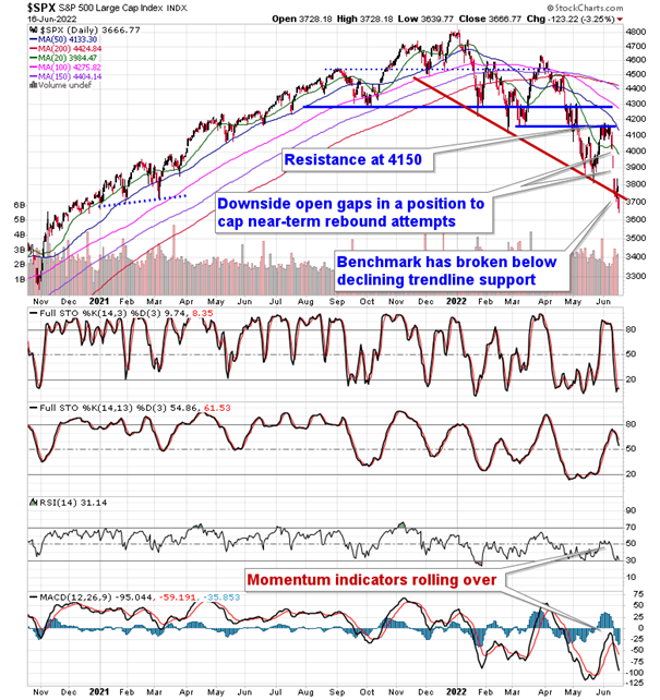 Stocks took another leg lower on Thursday as a slew of negative economic data-points and ongoing reaction to the FOMC announcement on Wednesday had investors looking to shed further risk in portfolios.  The S&P 500 Index dropped by 3.25%, breaking below declining trendline support that had been keeping the selloff orderly since the year began. Traditionally, the market moving from an orderly to disorderly decline as investors seek to aggressively get out of positions typically marks the beginning of the end to declining trends.  Momentum indicators are reaching back towards oversold extremes with the Relative Strength Index on the verge of crossing below the 30-threshold that acts as the borderline for declaring an oversold state.  It was the riskiest segment of the market that fuelled the decline with the consumer discretionary and energy sectors down around 5% on the day while the more defensive consumer staples sector was just marginally lower.  Risk aversion is implied, however, for those that have staked their claim in some of the more defensive segments of the market are not feeling much comfort given the breakdown in many lower-beta bets (staples, utilities, REITs) in recent days.  The price action resembles an investor base that just wants out, but this flood of selling is more likely to lead to a tradable low in stocks as downside exhaustion becomes realized.  We are not there yet, but getting close.