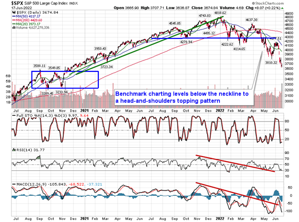 Stocks attempted to stabilize into the end of the week as a rebound technology names helped to elevate broader market benchmarks off of their lows. The S&P 500 Index closed with a gain of just over two-tenths of one percent, charting a rather indecisive doji candlestick below declining trendline support. With a selloff into the close ahead of the long weekend, this was not the type of trading action desired to suggest a significant low for stocks. Momentum indicators continue to show characteristics of a bearish trend with RSI bordering oversold territory just above 30 and MACD moving back to the lows of the year. The benchmark remains severely stretched to the downside and, as we get into the mean-reversion period for the market in the remaining days of month, followed by the start of the summer rally period, it will be difficult for the bears to maintain this condition into month and quarter-end.