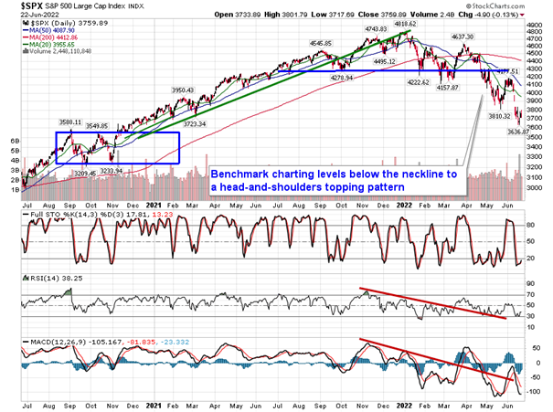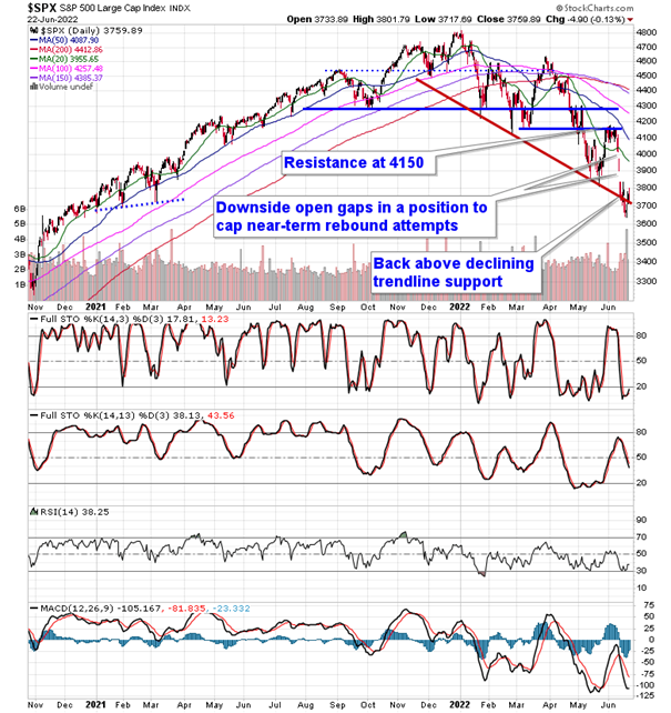 Stocks see-sawed on Wednesday as traders weighed comments from Fed Chair Jerome Powell and digested another dip in the price of oil.  The S&P 500 Index closed marginally down on the day, falling by just over one-tenth of one percent and ending almost precisely around the mid-point to the session’s range.  The benchmark is sitting just above declining trendline support, now at 3700, which had been keeping the selloff this year orderly.  Resistance around declining moving averages remains firmly intact. MACD is showing increasing signs of curling higher in what could amount to a positive momentum divergence compared with price, an indication of waning selling pressures and a precursor event to a shift of trend.  A distribution pattern below 3800 is still assumed, something that still has a good chance of frustrating the bears and leading to the start of the summer rally for stocks that stretches into the month of July.