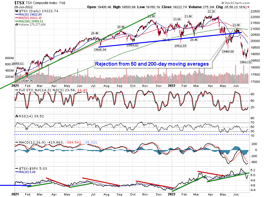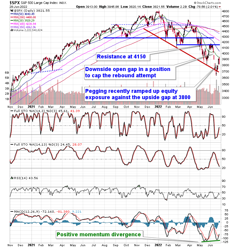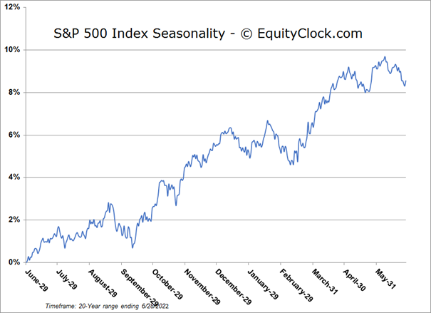 Stocks erased early morning gains to close solidly negative on Tuesday as recession concerns continue to proliferate. The S&P 500 Index dipped by 2.01%, turning lower from its declining 20-day moving average and turning back to Friday’s upside gap at 3800. While the gap between 3840 and 3900 has now been closed, the higher gap between 3975 and 4020 remains untested, threatening to keep a cap above the market intact, despite the positive seasonal framework that we find ourselves in over the next few weeks. The hope remains that evidence of waning selling pressures in recent weeks, as gauged by the positive momentum divergence with respect to MACD, allows the bulls to feel confident that the worst is behind us, at least for now. While major momentum indicators are still showing characteristics of a bearish trend below their middle lines, the divergence provides a hint that we are at or near a point of downside exhaustion, often conducive to a turning point in the negative trajectory of the market. This is, however, not the ideal setup that we had been forecasting/expecting for the end of the first half of the year, a timeframe that was seen as presenting the logical point to see a low to our forecasted first half of the year weakness. We continue to hold a stop of 3800 for our recently ramped up equity exposure in the Super Simple Seasonal Portfolio, but we also continue to hold a large amount of cash that we would love to deploy upon a stronger tenchical setup. While hints of downside exhaustion are conducive to take the step to incrementally increase risk, unfortunately we do not see the framework yet to take the plunge that seasonal tendencies suggest we do heading into the start of the new quarter. More work is required on the gap overhead to eliminate perceived hurdles that may cap a sustained rebound attempt into the third quarter, as various seasonal studies suggest we should see.