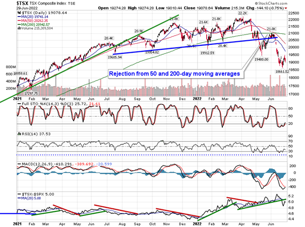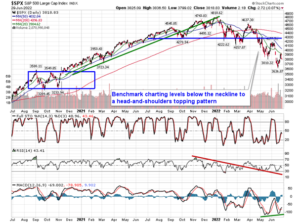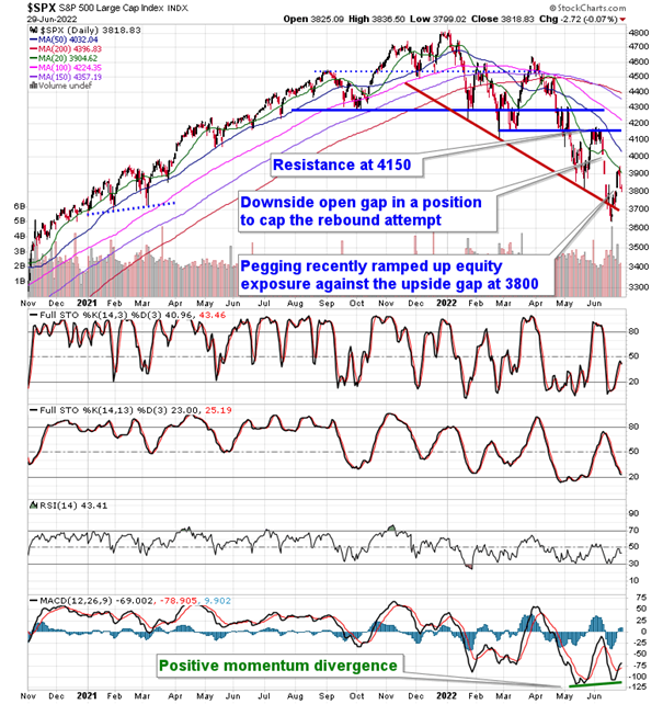 Stocks gyrated around the unchanged mark on Wednesday as portfolio managers continue to rebalance their books into quarter-end while scrutinizing the risks of an economic recession later this year.  The S&P 500 Index closed down by just less than a tenth of one percent, charting a rather indecisive doji candlestick on the day.  Friday’s upside gap at 3800 that we have been pegging recently ramped up equity exposure off of was tested as support at the lows of the session.  The declining 20-day moving average continues to act as a near-term cap, while the downside open gap between 3975 and 4020 threatens to stand in the way of the upside potential suggested of the summer rally period for stocks that is upon us.  Momentum indicators continue to show characteristics of a bearish trend, however, a positive divergence with respect to MACD is hinting of waning selling pressures, often a pre-cursor to a change of trend.  This market is still in need of a sentiment reset in order to keep the longer-term downside trajectory of the market intact and the likelihood of realizing that reset higher through the weeks ahead, during the average summer rally period for stocks, is still fairly good, but the highly tenuous trading action keeps us with an elevated level of caution until we obtain the technical backdrop that is required to draw in broader participation to fuel a more sustainable upside move.