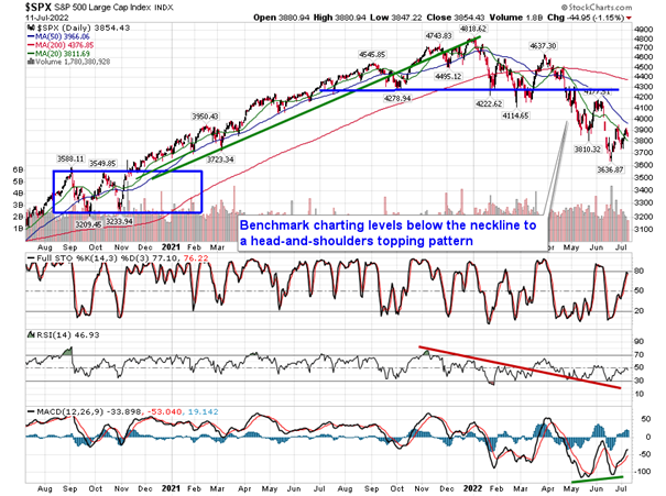 Stocks closed lower on Monday as a jump in the US dollar and nervousness ahead of the start of earnings season had investors trimming risk. The S&P 500 Index ended lower by 1.15%, turning down from declining trendline resistance that currently hovers around 3900. The declining hurdle encompasses the upper limit of a declining wedge pattern, which is typically an indication of waning selling pressures, a precursor condition to the shift in the negative trend of the market. The positive divergence with respect to MACD continues to attest to the same. Assuming the pattern continues and extrapolating out the trends, the wedge points to an apex around 3500 by the start of September. The buy point to the setup is typically realized upon a breakout of the upper limit of the narrowing range, something that we are anticipating at some point during the third quarter, possibly as soon as this month. This market still has much work to do in order to move beyond its declining path that it has been in this year, but hints continue to emerge that we are closer to a low than not, which translates into improved risk-reward.