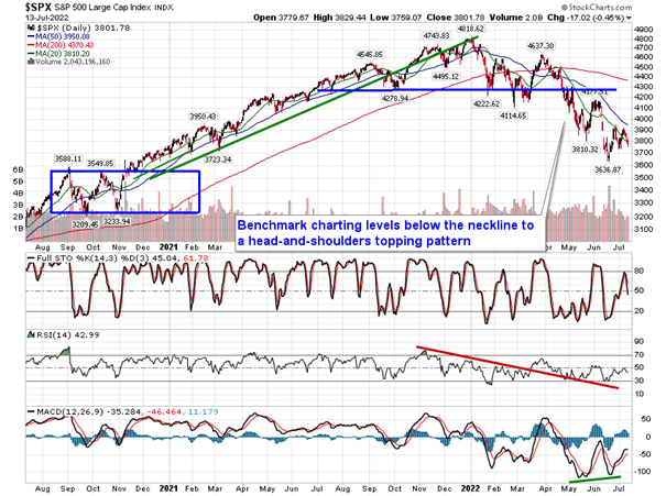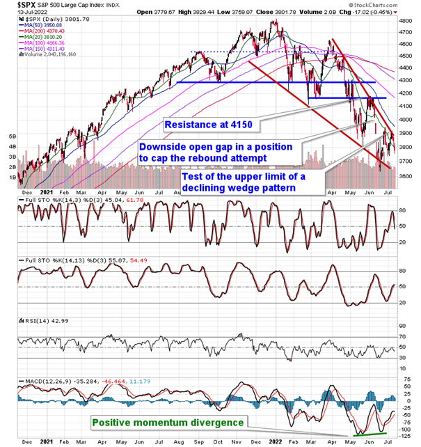 Stocks slipped on Wednesday as traders digested a much hotter than expected read of consumer prices in the US. The S&P 500 Index fell by less than half of one percent, ending at the pivotal 3800 level that we have highlighted exhaustively over the past few months. The upper limit to a declining wedge pattern continues to act as the cap to the recent wave higher in this ongoing trend of lower-lows and lower-highs. The start of July lows around 3750 remains our stop level to recently ramped up equity exposure in order to participate in this summer rally period that we are still giving some leeway towards. Momentum indicators are rolling over again below their middle lines, keeping the characteristics of a negative trend intact. The buy point to the narrowing declining range continues to be pegged at trendline resistance that is just below 3900. Between here and there, we are stuck in this rather neutral state for this summer rally period that has been rather lacklustre, thus far.
