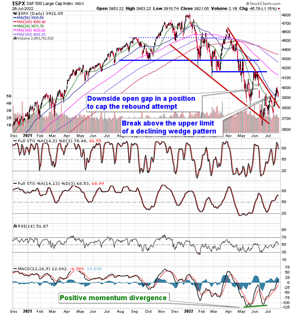 Stocks closed lower on Tuesday as investors braced for an onslaught of earnings in the technology sector after the closing bell. The S&P 500 Index shed 1.15%, trading back to and testing the recently broken 50-day moving average at 3919 as a level of support. This is often a hurdle that investors will tend to revert to ahead of an uncertain event, such as what scheduled earnings presented. The uncertainty ahead of the FOMC announcement on Wednesday is another consideration. Previous declining trendline resistance can be pegged at 3800. Both MACD and RSI are holding above their middle lines as they attempt to relinquish the characteristics of a bearish trend that has proliferated since the year began. Despite the pullback in recent days, this is still a market that is trying to firm a base, albeit one that still has a lot of question marks tied to it given the intermediate path of lower-lows and lower-highs that remains unviolated.