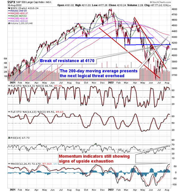 Stocks rallied on Wednesday as a weaker than expected read of consumer prices in the US increased optimism that inflationary pressures in the economy have peaked. The S&P 500 Index closed higher by 2.13%, jumping past the May/June highs around 4170 in what was the last line in the sand defining the intermediate-term trend of lower-lows and lower-highs. Increasingly, evidence is materializing that we are moving beyond this negative trajectory that we have been in since the year began as stocks fulfill the back half of the year strength that we have been forecasting since the year began. The next critical hurdle is the declining 200-day moving average at 4332, a level that closely aligns with declining trendline resistance derived by joining the peaks from the January and March highs. This would be the logical point for this market to pause and digest again, assuming the near-term trajectory continues unhindered. Momentum indicators are still showing signs of upside exhaustion in what is still expected to amount to a pullback/retracement through the middle of August. While we will remain stubborn to our somewhat downbeat near-term view, the ammunition for the bull case for the back half of the year rebound in the market just got that much stronger on Wednesday with the violation of the May/June highs and it has become difficult for the bears to defend their negative bias given that levels of resistance are easily being broken while levels of support are firming. The risk-reward in the near-term is still not present to be aggressively adding risk (stocks) at this juncture given the near-term pullback potential, but looking to buy the dip on the next pullback is the desired outcome.