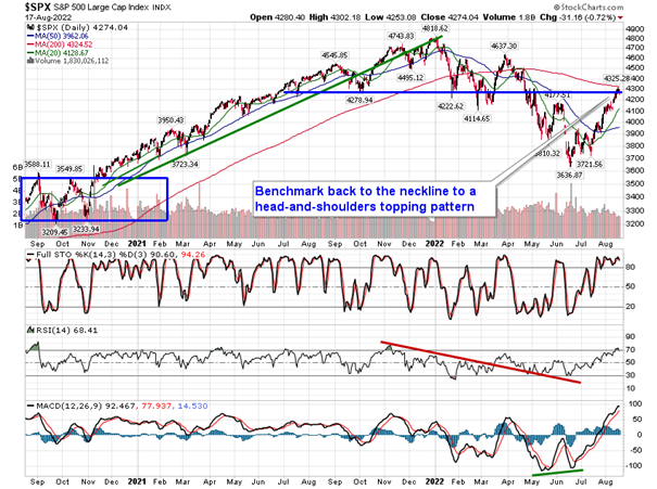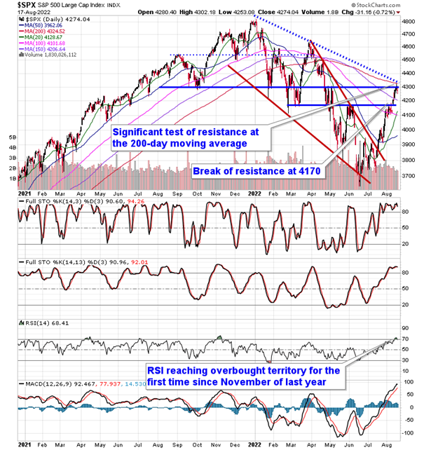Stocks closed lower on Wednesday as major market benchmarks start to react to resistance around their 200-day moving averages. The S&P 500 Index shed just over seven-tenths of one percent after reaching within one point of its long-term hurdle in the prior session. A digestion of the recent gains is deemed to be underway, one that could see the retest of levels of support below, such as the 20 and 50-day moving averages at 4128 and 3962, respectively. The relative strength index (RSI) has rolled over from overbought territory, falling below 70 and triggering a momentum sell signal. MACD is converging on its signal line in what could amount to a similar sell signal with respect to this indicator in the days ahead. But while these momentum indicators are rolling over, they are no longer showing characteristics of a bearish trend that dominated the first half of the year and the suggestion remains that a new intermediate trend has begun, one where buying the dip will likely prove to be appropriate.