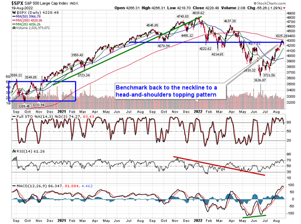 Stocks pulled back on Friday as traders continue to digest the gains from the recent rally.  The S&P 500 Index slipped by 1.29%, pulling back from the declining 200-day moving average that was tested earlier in the week.  Momentum indicators continue to rollover with MACD seemingly poised to chart an equivalent sell signal that the Relative Strength Index (RSI) triggered a few days ago.  But, as mentioned in our last report, while sell signals are triggering, momentum indicators are no longer showing the characteristics of a bearish trend that dominated the first half of the year, an indication that the market has turned a corner.  Support can continue to be pegged at the 20 and 50-day moving averages at 4156 and 3966, respectively.  A check-back and bounce from the now rising 50-day moving average, thereby charting a higher intermediate low, is still viewed as the ideal in order to ramp up risk (stock) exposure in portfolios for our forecasted back half of the year rebound.  We will take things one move at a time, however.