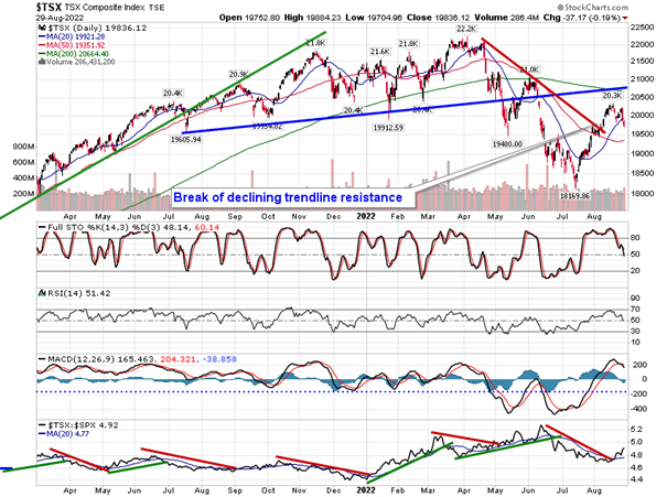 Stocks closed lower on Monday following massive market selloff that was realized in the week prior. The S&P 500 Index closed down by two-thirds of one percent after reaching down to levels around support at the rising 50-day moving average just above 4000. This intermediate hurdle had been suggested as a zone that could entice traders to step in to take advantage of the apparent shift of the intermediate trend. Levels down to the June lows are still fair game, but should the market accept a floor at this important hurdle, it would be difficult to be cautious of stocks given the re-adoption of a trend of higher-highs and higher-lows. The end of the month/start of new month could throw off some false signals amidst the end of period portfolio rebalancing, therefore best to tread cautiously. Momentum indicators relinquished characteristics of a bearish trend in the month of July as the market attempts to stabilize following the significant weakness recorded through the first half of the year.
