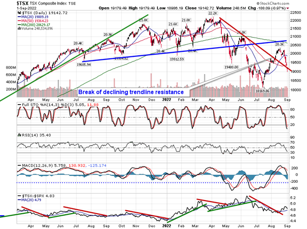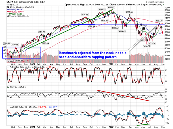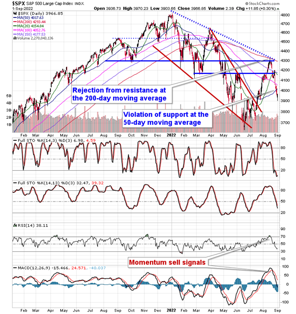 Stocks shook off concerns pertaining to higher rates and a stronger US Dollar on Thursday to close mildly higher. The S&P 500 Index closed with a gain of three-tenths of one percent, reversing a decline of over one percent at the lows of the session that saw the benchmark intersect with the psychologically important 3900 level. The benchmark remains below major moving averages and the fact that it has failed to close at or near the 20 or 50-day moving averages given the uncertainty pertaining to Friday’s payroll report is telling of the negative sentiment that has materialized in recent weeks. Typically, ahead of an uncertain/pivotal event, stocks will tend to pin themselves towards a major moving average. Momentum indicators are still pointing lower after rolling over from overbought territory just a few weeks ago and the MACD histogram continues to expand negatively, suggesting that we not yet near a new buy signal. We remain on the lookout for higher-lows with respect to RSI and MACD, along with price, above the June low, something that would provide a powerful signal that an intermediate bottom to the market is in, one that would be conducive to fuel a sustained multi-month rally. We are anxious to put our cash hoard back to work after pulling a large chunk of equity exposure upon the rejection of the S&P 500 Index from the 200-day moving average, some 250 points or so ago.