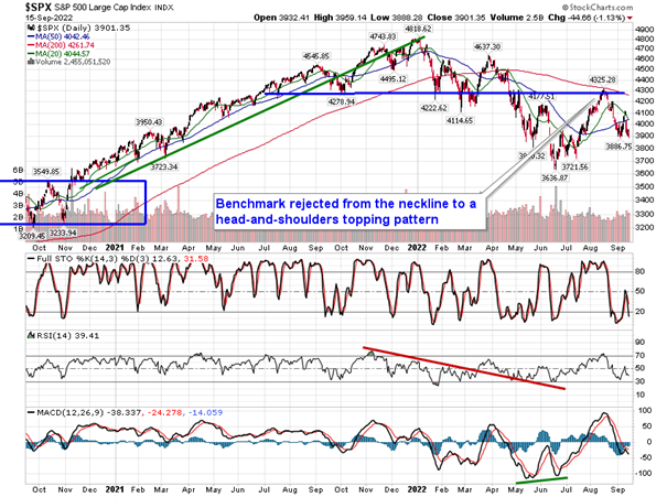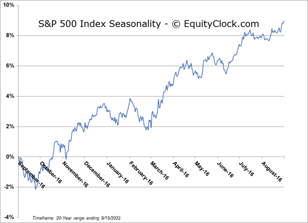 Stocks closed lower on Thursday as the market attempts to find a footing following Tuesday’s hotter than expected report on inflation in the economy. The S&P 500 Index closed down by 1.13%, ending right at the psychologically important 3900 level that has proven to be so pivotal in the past couple of weeks. Momentum indicators continue to attempt to extend their slide that started in the middle of August, although they still have a long way to go to return to levels that were recorded at the lows of the year in May, as is the case for MACD. Positive momentum divergences remain implied, signalling that selling pressures have faded since the downfall of the first half of the year, often a precursor event to the shift of the intermediate-term trend. We remain on the lookout for signs that this shift is becoming apparent, coinciding with the rise of the intermediate moving average at the 50-day, but, obviously, recent weakness has elevated the risk that this turn may not be realized anytime in the near-term. Stocks remain in their most volatile time of the year that spans the remainder of September and the month is certainly living up to its erratic history. October starts the strongest time of the year for stocks, therefore, when and if we see an turn of the intermediate-term trend of stocks, you are likely going to want to be a buyer for strength that spans the last few months of the year. For now, our core dividend holding in our Super Simple Seasonal Portfolio is providing the refuge that is desired in this volatile tape, but this is likely to provide the source of funds for higher-beta exposure to the market come the flip of the calendar into the fourth quarter.