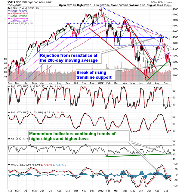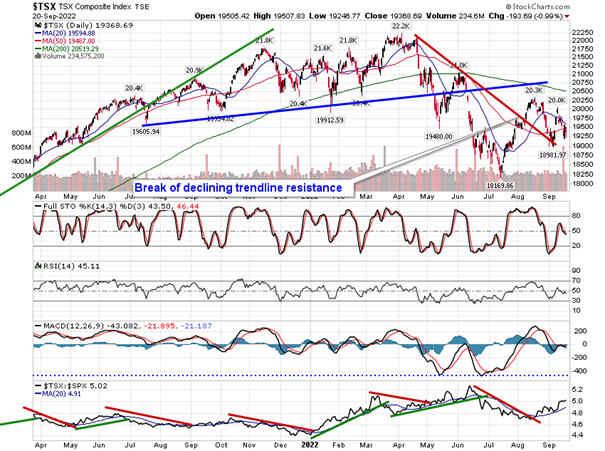 Stocks closed lower on Tuesday as investors braced for the Fed event on Wednesday. The S&P 500 Index closed down by 1.13%, continuing to hold below rising trendline support that was broken last week. Resistance can still be pegged at the 20 (~3993) and 50-day (~4041) moving averages, the latter of which continues to feel the pull on its recent rising path given that price is now firmly below. The Relative Strength Index remains in a rising trend, hinting of the same for stocks as indications persist that selling pressures have alleviated. Of course, the pivotal Fed announcement on Wednesday will have much to say about the near and intermediate-term path of stocks moving forward. The consensus in the market still appears overwhelmingly bearish, expressing that investors are already positioned for a negative outcome, therefore the better risk-reward may be to bet on a bullish outcome. We are staying on the fence in our low volatility equity allocation in the Super Simple Seasonal Portfolio and will seek the intermediate low in the market that will signal that risk-taking is now prudent. The benchmark is presently within a range of support between the June lows at 3636 and the recently broken 3900, a range that is still being looked upon as providing a base to our back-half of the year rebound following first half of the year weakness forecast.