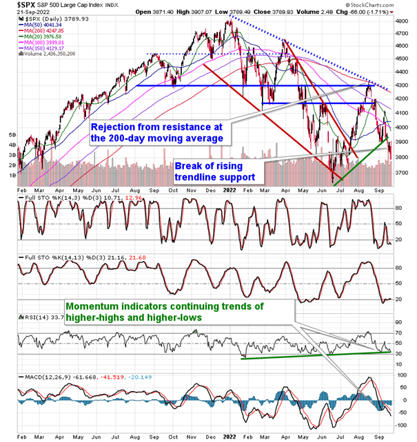 Stocks closed sharply lower on Wednesday as traders reacted to the Fed rate decision, which resulted in another 75-basis point increase in the overnight lending rate. The S&P 500 Index dropped by 1.71%, reaching further towards the June lows that are being heavily scrutinized as to whether they will in fact hold as the lows of the year. Resistance remains at the 20 and 50-day moving averages at 3976 and 4041 and the slope of the intermediate moving average continues to feel the drag of of prices below the variable hurdle. The benchmark remains in the June/July consolidation zone between 3636 and 3900, a range that continues to be pegged as support to the intermediate-term trend until, quite simply, it is broken. The intermediate turn that we have been seeking in order to become aggressive in stocks obviously remains absent at this point, but there is still not enough to pullback the reins again in the Super Simple Seasonal portfolio to lower beta back below neutral again, but we are watching our stops to our equity exposure closely, presented by the lows set at the start of September. The market has entered the heart of the traditional mean-reversion period attributed to end-of-quarter and end-of-month rebalancing, but with stocks reaching back to the unchanged mark on the quarter and firmly negative on the month, it has to be expected that much of the negativity that normally plays out through the last two weeks of September has played out. This could actually present a stabilizing effect in the near-term. In this period of volatility that is typical into the start of October, we won’t take anything as guaranteed, however, and sit with a healthy allocation to short/intermediate term bonds/cash and low volatility equities until such point that we can become confident that being aggressive again in stocks is warranted.