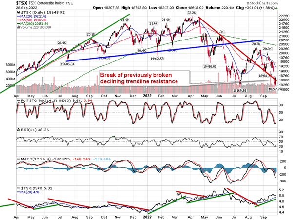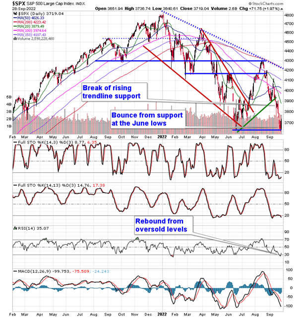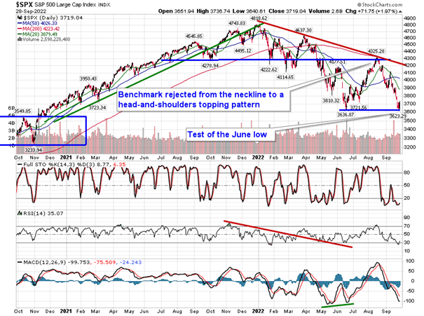 A sharp reversal in yields and the dollar helped to pick stocks up from the lows of the year on Wednesday as the Bank of England interjected in the bond market to add some stability to what had become a fragile tape. The S&P 500 Index surged higher by around 2%, bouncing firmly from levels around the June lows and moving back towards one of a few downside open gaps that have been charted over the past few weeks amidst inflation/rate fears. The first gap can be seen around 3745, representing Friday’s downside open. The more threatening gap can be seen just below the September highs around the now declining 50-day moving average at 4026. So long as major moving averages continue to point lower, using the hurdles as resistance to sell into is the appropriate course of action. The declining 20-day moving average can be seen at 3879. While the bounce from the June lows is a welcome relief, hinting of a double bottom, we would have to view the apparent point of support as part of a lower bound of a range that the market may find itself in through the end of the year. We have had to dampen our enthusiasm towards our forecasted back half of the year rebound in the market given the degradation in the technicals and the shift in the goal posts presented by the Fed’s year-end target for the key lending rate, however, we still foresee the typical November/December strength before another sustained downleg in stocks potentially appears in the new year, assuming the fundamental backdrop in the economy does not improve materially by then.
