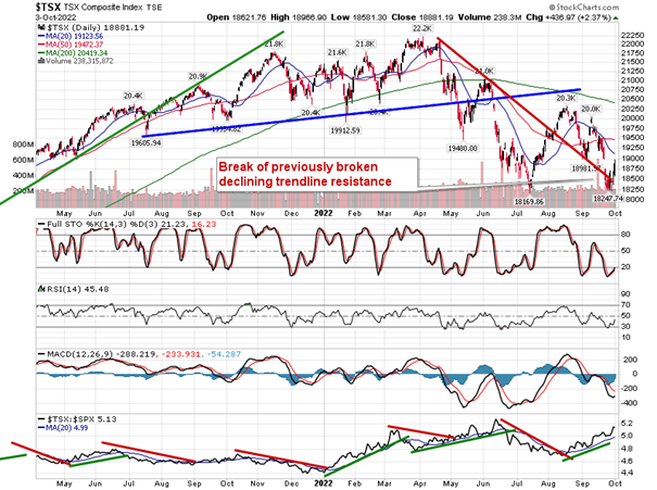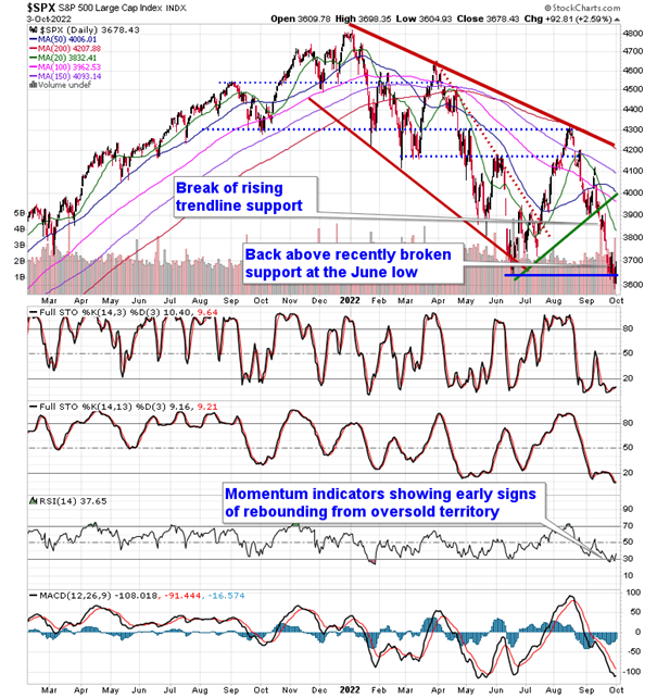 Stocks rallied to start the new month and the new quarter as the market attempted to move past the negativity that dominated the month of September. The S&P 500 Index jumped by 2.59%, moving back above recently broken support at 3636. Momentum indicators continue to show early signs of rebounding from oversold territory with the Relative Strength Index moving back above 30 and the MACD histogram continuing to narrow. MACD itself is showing initial support around the May/June lows, not providing the confirmation that last weeks breakdown in price below the equivalent level was definitive. Major moving averages, including the 50-day, are still pointed lower, which, until the trajectory shifts, provide hurdles to sell into in order to lighten up on equity exposure in the near-term. The market has entered into the more profitable fourth quarter of the year, a period that typically sees volatility fall off from its third quarter ramp, and we remain on the lookout for evidence of a shift of the intermediate-term trajectory of the market, one that will lend itself to the back half of the year strength following first half of the year weakness that we have been forecasting since the year began.