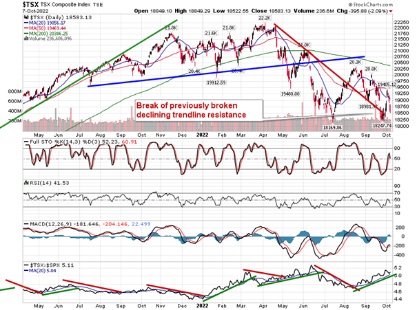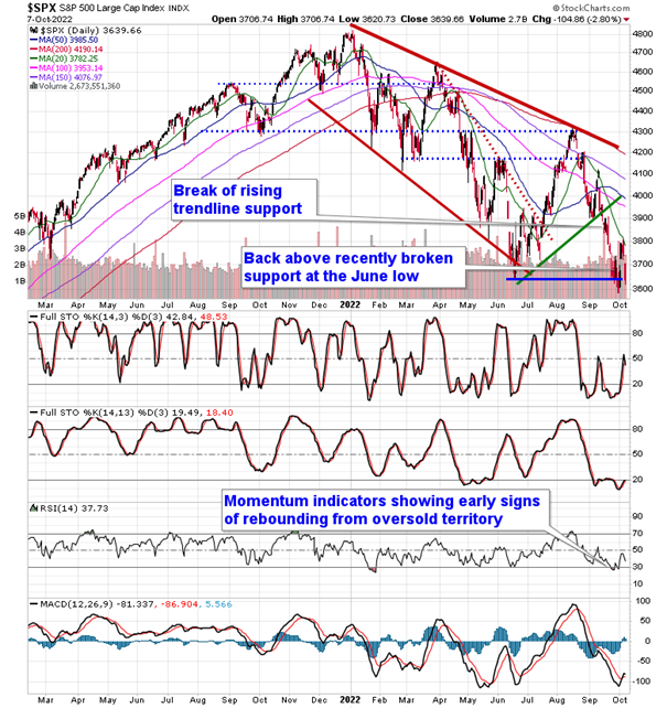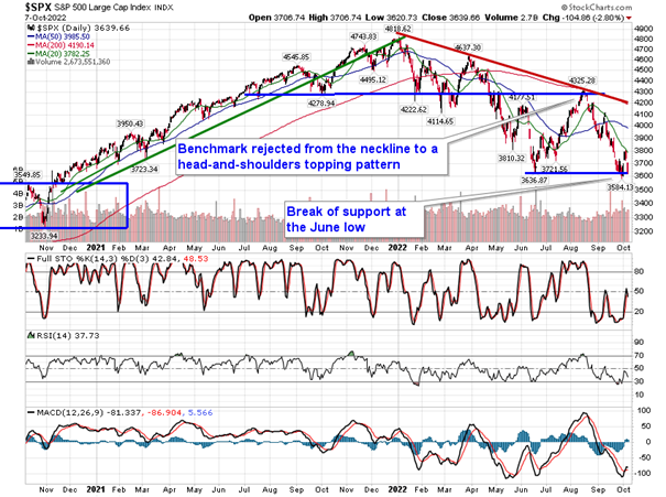 Stocks ended the week on a sour note as a stronger than expected payroll report for September stoked renewed fears that the Fed would continue to aggressively raise rates for the foreseeable future. The S&P 500 Index slid by 2.80%, closing right at the June low that has been so pivotal to the market over the past couple of months. Momentum indicators are quickly losing any positivity that had been derived by early week strength, although MACD has yet to cross back below its signal line in what would amount to a renewed sell signal. Characteristics of a bearish trend remain firmly entrenched. Friday’s downfall gaps back below the upside gap that was charted on Tuesday at 3700, emphasizing the significance of this zone and what was a level to shoot off of on the long side now becomes a hurdle to shoot off of on the short side. Major moving averages remain in positions of resistance, including the 20-day moving average at 3782 and, more importantly, the 50-day at 3985. As has been highlighted, using the major moving averages to sell into in order to lighten up on equity exposure remains the prudent course of action until the intermediate path of the market definitively shifts. Friday’s gap lower has once again confirmed that this is a market that is more willing to ignore levels of support while holding firm at levels of resistance, which is not the technical backdrop to be aggressive in portfolio positioning.