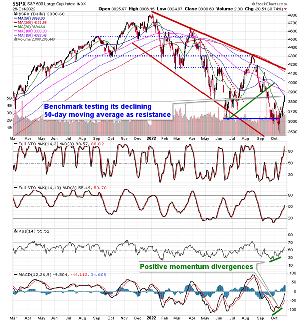 Stocks traded mixed on Wednesday as a poor reaction to earnings from Alphabet (GOOGL) and Microsoft (MSFT) led to a pause in the recent strength in the S&P 500 Index. The large-cap benchmark fell by three-quarters one percent, showing initial negative reaction to declining resistance at the 50-day moving average and horizontal resistance at 3900. Early signs of buying exhaustion have been provided at this intermediate barrier, a level that we have speculated will serve as a hurdle to sell into in order to reduce equity exposure. The lack of definitive reaction to the intermediate resistance makes this call less certain, for now. The ultra-short-term trend of the market still remains that of higher-highs and higher-lows and momentum indicators continue to point higher. Previous short-term resistance at the 20-day moving average is in a position of support around 3700. Despite the negative reaction for this benchmark on the day given its weight in the technology sector, there is not the catalyst, as of yet, to suggest reducing equity exposure again in order to shelter against the more intermediate declining trend in the market that remains intact. While our cash allocation in the Super Simple Seasonal Portfolio is at one of the lowest levels of the year following recently increased risk exposure amidst the bottoming of stocks and bonds, we are willing and able to ramp our cash allocation higher again should conditions warrant. Seasonally, the close of the 27th of October has traditionally been the best time of the year to be a buyer of stocks to take advantage of the best six months of the year for the equity market and we are more inclined to sit with our elevated risk exposure at least until we get through one of the strongest parts of November at the beginning of the month.