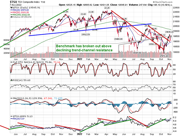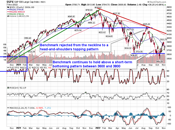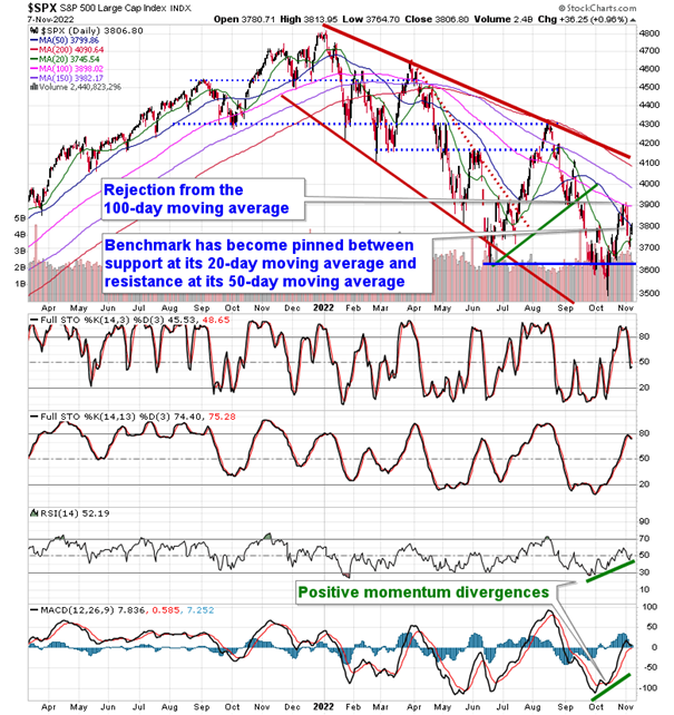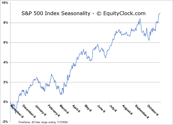 Stocks kicked off the new week with a gain as investors position ahead of the US midterm election on Tuesday and the highly scrutinized inflation report on Thursday.  The S&P 500 Index closed with a gain of just less than one percent, continuing to bounce from its rising 20-day moving average and intersecting with its declining 50-day moving average.  Momentum indicators continue to show a positive divergences compared to price, although signs of rollover remain with MACD bordering on a sell signal, should it cross below its signal line.  A number of points of resistance presented by declining major moving averages persists overhead, threatening to cap any near-term advance, however, seasonality provides the leeway for a positive bias of stocks into year-end.  Our focus are on those groups of the market that are identified with an Accumulate rating (list presented to subscribers below) according to our weekly chart books as these are the segments that are and will attract sustained buying demand into year end.