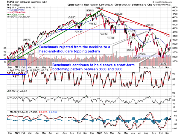 Stocks closed out a volatile session as headlines crossed the tape that Russia may have fired rockets on NATO ally Poland.  The S&P 500 Index ended with a gain of just less than nine-tenths of one percent, charting a rather indecisive doji candlestick around a significant pivot point and psychological hurdle at 4000.  In addition to the significance of the round number, the hurdle is just below the downside open gap that was charted in the middle of September between 4030 and 4080, a zone that will provide some supply in the market for the bulls to chew through.  The benchmark remains in a short-term rising trend following last week’s breakout above short-term resistance around 3850 and a cup-and-handle pattern targets an upside move toward 4200A short-term pause/digestion of the recent strength remains desired in order to place the benchmark on a solid footing ahead of the next seasonally strong timeframe surrounding the US Thanksgiving holiday, which is now just over a week away.  Momentum indicators are trending higher, moving into the upper halves of their ranges and attempting to define characteristics of a bullish trend.