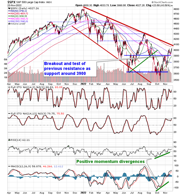 Stocks closed higher in the pre-Thanksgiving session as market participants digested the minutes from the last FOMC meeting.  The S&P 500 Index added another six-tenths of one percent, making further progress above psychological resistance around 4000.  Major resistance at the declining 200-day moving average is directly overhead around 4060, followed by declining trendline resistance around 4100.  The target of a cup-and-handle bottoming pattern continues to point to an upside objective of 4200, a hurdle that has marked horizontal support and resistance earlier this year.  Momentum indicators continue to point higher, relinquishing their bearish characteristics that dominated through much of this year.  The positivity that surrounds the US Thanksgiving holiday typically stretches into the month of December, at which point the next digestive phase attributed to end of year portfolio rebalancing/tax-loss selling begins.  We continue to sit with our increased risk exposure in the Super Simple Seasonal Portfolio that was implemented at the end of last week, but we remain willing and able to adjust should conditions warrant beyond this seasonally upbeat timeframe.
