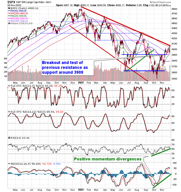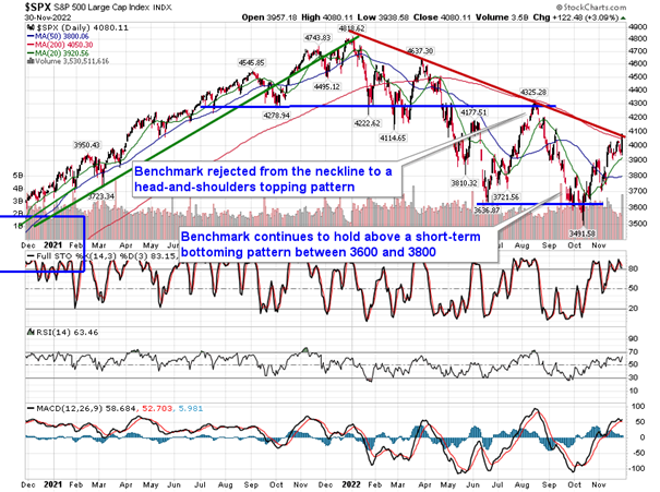 Stocks surged higher on Wednesday following signals that the Fed would be less aggressive in its monetary policy tightening path moving forward. The S&P 500 Index rebounded from recent weakness to close higher by an impressive 3.09%, moving above the 200-day moving average for the first time since March. In an instant, the benchmark has closed the downside open gap that was charted in September between 4037 and 4083, a zone that presented significant resistance over the past 12 weeks. Declining trendline resistance just below 4100 is now the test, a hurdle that will either make or break the declining path the benchmark has been on this year.As has been highlighted in recent reports, short-term bullish setups presented by way of a bull-flag and a cup-and-handle pattern projects an upside target to 4200, which, if realized, would see declining trendline resistance violated.Horizontal support at 3900 and the convergence of moving averages (eg. 20, 100, and 150-day) just above the horizontal hurdle present a solid point of support to the ongoing rising short-term trend heading into another seasonally strong month of December.