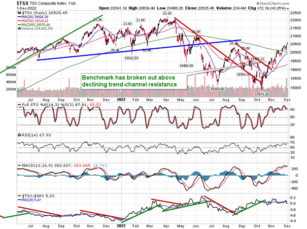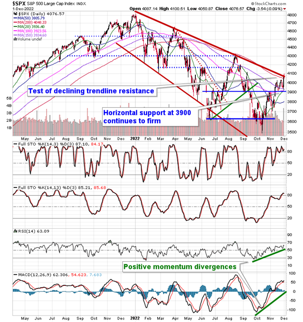 Stocks closed mixed on Thursday as investors wait for the results of the monthly non-farm payroll report slated to be released on Friday. The S&P 500 Index closed down by a mere tenth of one percent after reaching up and testing long-term declining trendline resistance around 4100 intraday. Heading into the pivotal employment report, the benchmark remains supported by a confluence of major moving averages (20, 100, and 150-day) just above horizontal support at 3900 and attempts to hold support at the now broken 200-day moving average are being made. Momentum indicators continue to trend higher following their end of September lows and characteristics of a bullish trend continue to be adopted above their middle lines. Short-term bullish setups continue to point to an upside target of 4200.