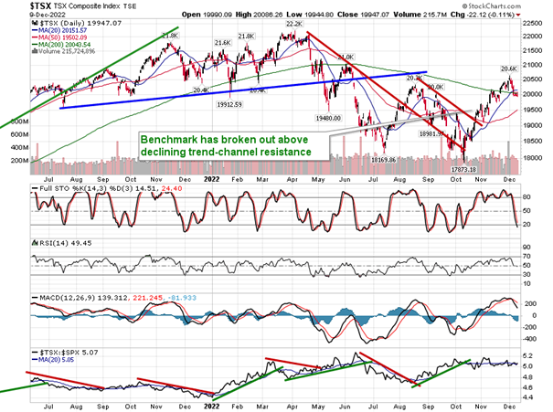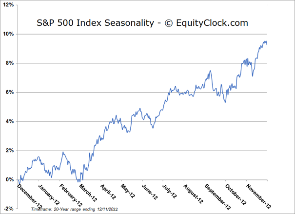 Stocks closed mixed on Friday as a hotter than expected read of producer prices reinvigorated concerns that the inflationary problem in the economy is still very much intact.  The S&P 500 Index closed lower by nearly three-quarters of one percent, effectively reversing the prior day’s gain.  The benchmark remains between horizontal support at 3900 and declining trendline resistance at 4050.  With catalysts encompassing November’s Consumer Price index and the December Fed meeting poised to impact the market in the week ahead, it is likely to see this recent consolidation range broken, whether that be higher or lower.  Seasonality in the back half of the month suggests a positive bias, but, until then, the market remains in this weaker half of December when portfolio managers still have their finger on the button of buy and sell trades.  Momentum indicators remain on sell signals following the selloff realized earlier in the week and the market benchmark still appears top heavy following its inability to retain levels above the 200-day moving average.  The longer-term trend of lower-lows and lower-highs remains intact, coinciding with the deterioration of the fundamentals in the economy, and at this point, we only have the positive seasonality for the back half of December as the “hope” that prices can improve between now and the start of the new year. While we still see the Santa Claus rally period for stocks between December 15th and January 6th as showing high potential for gains, how we get there and how the market digests the catalysts of the days ahead, before this strong seasonal timeframe, is anybody’s guess.  Best to stay on your toes for the week ahead as we try to maintain a positive bias of risk assets through year-end, while remaining cognizant of the risks that the technicals and the fundamentals are espousing.