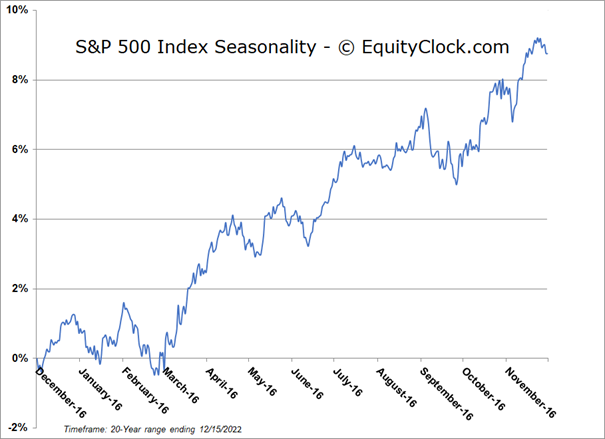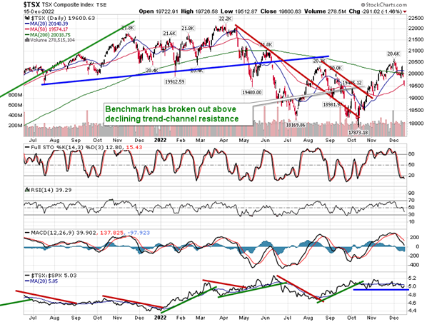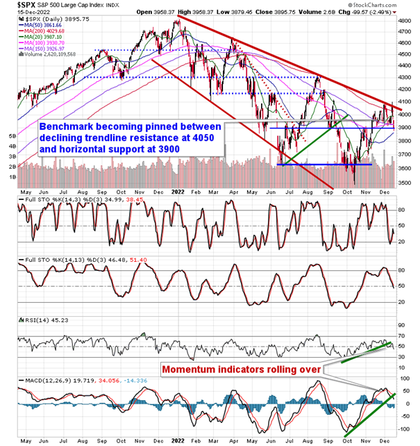 Stocks dipped on Thursday as a slate of downbeat economic reports forced investors to hit the sell button. The S&P 500 Index plunged by 2.49%, showing ongoing negative reaction to declining trendline resistance overhead, now hovering around 4050. Horizontal support at 3900 was tested and slightly breached around the lows of the day, but the break of this pivotal point of horizontal support was by no means conclusive. The rising 50-day moving average at 3861 remains in a position of support to the intermediate-term trend, a hurdle that we will be looking towards to provide the footing to the Santa Claus rally that is slated to begin in the days ahead. Remember, the first half of the month is dictated by tax-loss selling/end-of-year portfolio rebalancing, a tendency that we have indicated in recent days as perhaps being more prolonged this year given the significant uncertainty that the market exhibited in recent days amidst the release of the November CPI report and the FOMC announcement. The negative impact from these end of year portfolio transactions could continue into the new week before traders start to step away from their desks for the end of year holidays, resulting in the normal holiday influenced uptick in prices that runs through to the start of the new year.The techicals continue to provide an ominous backdrop going into this traditionally upbeat timeframe ahead, but it is difficult to sustain negative momentum through this upbeat period ahead given that investors will not desire to be offside while enjoying the time off through year end.