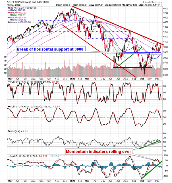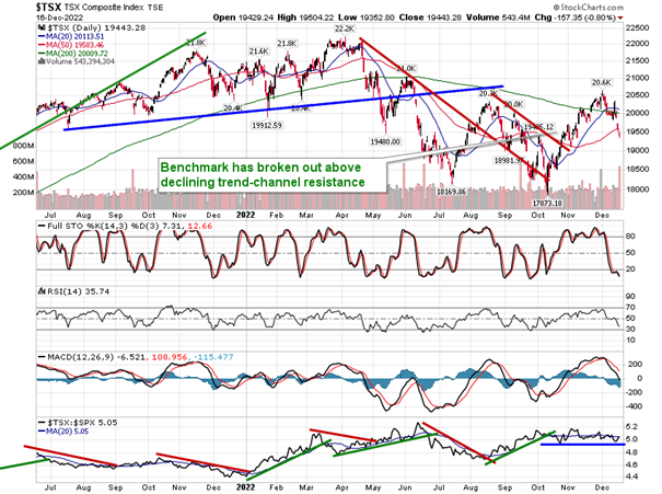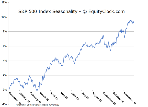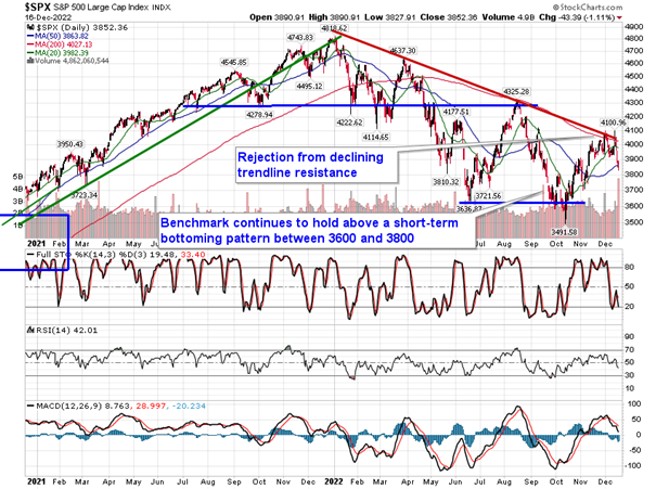 Stocks dropped again on Friday as traders continue to react to the slate of downbeat economic datapoints that have been released this week, along with the ominous technical setups that has major benchmarks rolling over around levels of significant resistance. The S&P 500 Index posted a loss of 1.11% to close the week, ending marginally below its rising 50-day moving average and starting to close the significant upside gap that was charted at the start of November between 3770 and 3860. The rollover below declining trendline resistance around 4050 continues and a double-top pattern around 4100 can be picked out. But while the technical setup becomes increasingly threatening by the day, something that warranted multiple downgrades in our last weekly chart books, we have reached the point in the calendar that positivity surrounding the end-of-year holidays is typically observed (see the daily pegged seasonal charts at the end of this report) and betting on the continuation of selling pressures through the end of the year is typically inappropriate, despite what the technicals have pointed to. The benchmark reached short-term oversold territory following the declines that capped off the week and, while we cannot rule out final portfolio jockeying attributed to tax-loss selling/end-of-year transactions into the start of next week, there is now a very good likelihood that we will see prices higher between now and the end of the Santa Claus rally period that peaks at the start of the new year.Using the strength attributed to this end-of-year phenomenon is still view as potentially the last opportunity to position for what could be a tougher period for the market ahead, something that we are heavily scrutinizing coincident indicators for to determine the timing of when a negative bias is warranted.