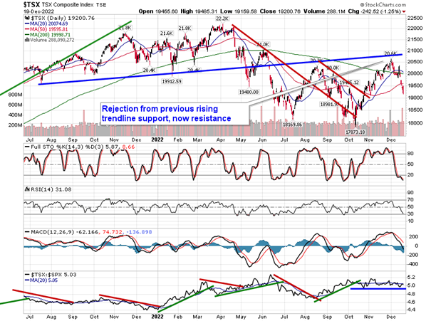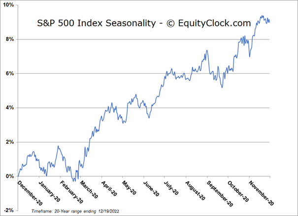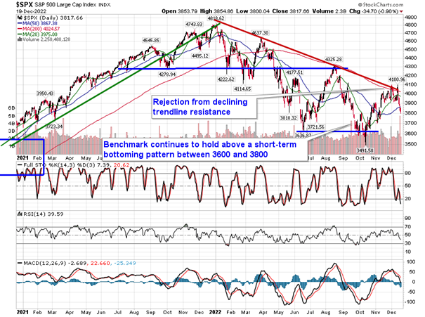 Stocks continued to struggle coming into the new week as the technical degradation that followed the FOMC announcement last week persisted. The S&P 500 Index closed down on the session by nine-tenths of one percent, charting a definitive break below the rising 50-day moving average at 3867. Momentum indicators remain on sell signals following the bearish cross that was triggered with respect to MACD on December 5th and the MACD histogram continues to expand negatively. The 20-day moving average, which has been pointing higher since October, is now showing a negative slope, indicative of the direction of the short-term trend that is upon us. The upside gap that was charted in November between 3770 and 3860 continues to be filled and we continue to look to this zone as the basis of support for the Santa Claus rally period ahead.The technical backdrop of the market certainly appears threatening and the downturn in recent days may be the start of the next substantial leg lower in the market, but we would be unable to adopt the bearish bias that the technicals suggest so long as we are in this end of year seasonal strength pattern that still has a high likelihood of supporting stocks through the weeks ahead.We continue to look for the more appropriate opportunity, aligning with the three prongs to our approach (technicals, fundamentals, and seasonals), to become more conservative in portfolio positioning, something that is likely to be seen around the start of the new year.
