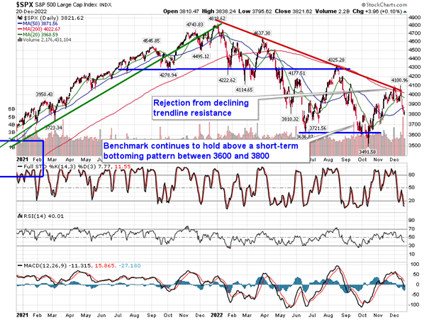 Stocks edged higher on Tuesday as a reprieve in selling pressures provided hints that the negativity surrounding the front half of December tax-loss selling/portfolio rebalancing period has come to an end.  The S&P 500 Index closed with a minor gain of one tenth of one percent, charting a rather indecisive doji candlestick as the benchmark struggles to overcome short-term oversold territory.  The benchmark remains in the span of the upside open gap between 3770 and 3860 that was charted early in November, a zone that continues to be looked upon as logical support for the Santa Claus rally period that is now upon us.  The more intermediate trend of the market remains that of lower-lows and lower-highs, capped by declining trendline resistance just above 4000, while a minor point of resistance can be pegged around 3900.
