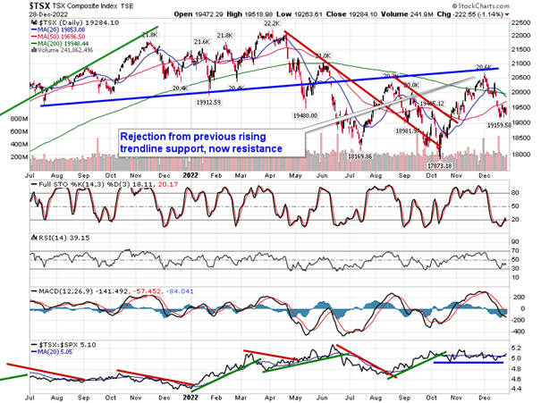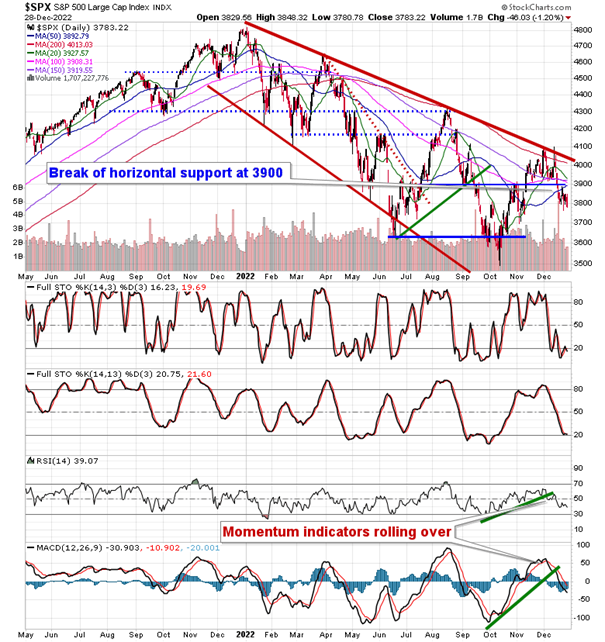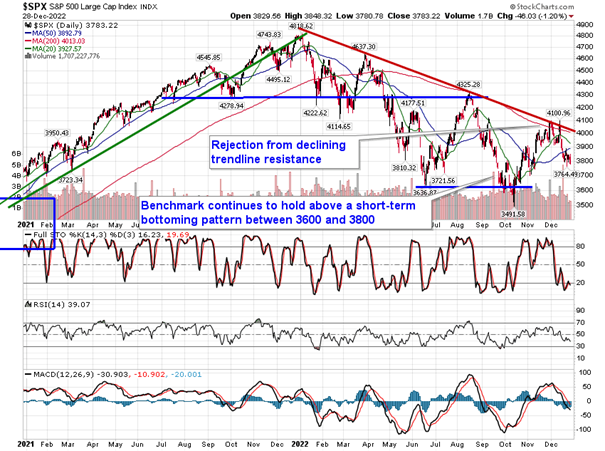 Stocks struggled again during this notorious Santa Claus rally period as news released intraday indicated that travellers from China are required to show a negative COVID test before entering the US, reigniting concerns of what the impact of this virus will have on economic activity, both here and abroad. The S&P 500 Index closed lower by 1.20%, remaining within a tight consolidation range just below the 50-day moving average and horizontal support at 3900, both of which were broken in recent weeks. A significant convergence of the 20, 50, 100, and 150-day moving averages is becoming apparent at the aforementioned horizontal pivot point at 3900, which further ingrains the sensitivity of this market to this zone across multiple timeframes. The pattern charted over the past month resembles a bear-flag, which proposes a downside target back to the October low around 3500.The technicals heading into the new year continue to look threatening and there is not much on the fundamental side to point to as reason for optimism. The only thing that has prevented us from adopting an outright bearish stance across a broad range of investments is the fact that we remain in this seasonally positive timeframe, a period that tends to be more supportive of stocks than not. The benchmark remains in the zone of November’s upside gap between 3770 and 3860, a span that is keeping the benchmark afloat, for now, but it is becoming increasingly difficult to avoid selling, yet, after benefitting from the rebound in the market from the October low.