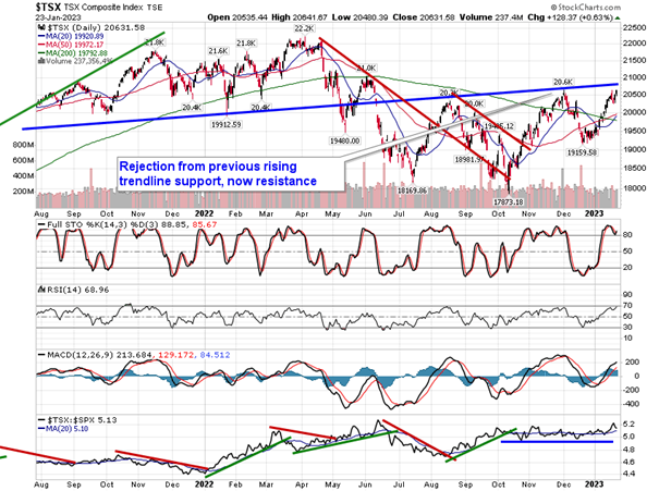 Stocks strengthened to start the new week as investors continue to neutralize negative bets in portfolios given the uncertainty that surrounds earnings and the prospect of a pause in the rate hiking cycle following the next FOMC meeting. The S&P 500 Index closed with a gain of 1.19%, moving marginally above declining trendline resistance that has been threatening stocks for the past year. Support has been confirmed at the 20-day moving average following Friday’s bounce and the declining 200-day moving average is being surpassed. Momentum indicators continue to show a rather neutral look around their middle lines in what has become a rather uncertain look for US equities, overall. Lower-highs on RSI and MACD over the past five months are being offset by higher-lows in what, again, is a rather neutral looking chart. Seasonal tendencies suggest a softer period for equity market performance that runs through the month of February before strength lifts the tape through the spring, therefore there is not too much to be overly aggressive on in domestic risk assets (stocks) from a calendar year timing perspective and we can allow this neutral path to resolve before taking a bet, one way or the other. Fortunately, there are alternatives to domestic equities that are worthy to be invested in.
