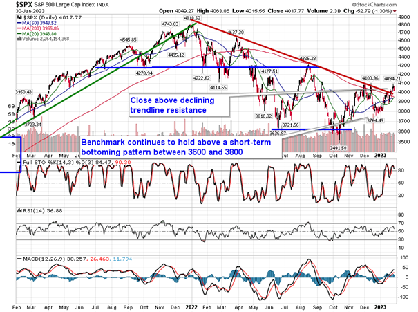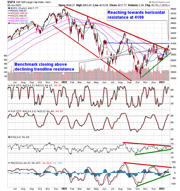 Stocks dipped on Monday as investors took down some risk ahead of the FOMC meeting on Tuesday/Wednesday.  The S&P 500 Index ended the session with a loss of 1.30%, peeling back towards declining trendline resistance that was broken in the past week.  Horizontal resistance at the December high of 4100 remains intact, keeping the trajectory of lower-highs from the past year intact.  Momentum indicators are showing early signs of rolling over below declining trendline resistance in what has become a narrowing range over a number of months, defining a rather neutral momentum backdrop.  The 50-day moving average seems poised to cross above its declining 200-day moving average in what is referred to as a golden cross, but, as has been pointed out in recent reports, the timeliness of this technical event as an immediate buy or sell indicator is typically quite poor, implying that buying the near-term crossover may be inopportune.  Seasonally, stocks remain in a soft period into the start of March.