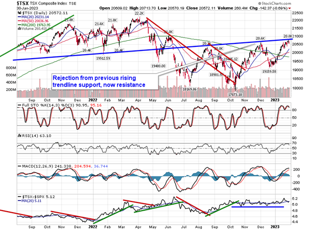 If a risk-aversion move is to materialize, this is a logical point for it to happen as the ratio of the Staples (XLP) over Discretionary (XLY) ETF tests long-term rising trendline support.