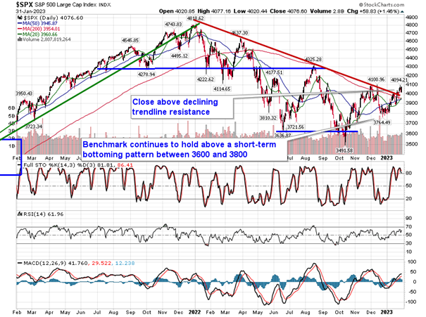 Stocks gained to close out the month of January as investors continue to neutralize negative bets ahead of month-end reporting, the upcoming FOMC announcement, and the ongoing release of earnings reports.  The S&P 500 Index ended higher by 1.46%, erasing the loss that was realized to start the week.  The large-cap benchmark remains above former declining trendline resistance, but below the highs set in the month of December at 4100, presenting a critical line in the sand that is keeping the path of lower-highs on an intermediate to long-term basis intact.  Momentum indicators continue to show early signs of rolling over with the MACD histogram increasingly narrowing back towards 0.  The technical framework to the market continues to give bias to a neutral view and we are waiting for the trend to evolve to suggest either and bullish of bearish mentality for the months ahead.