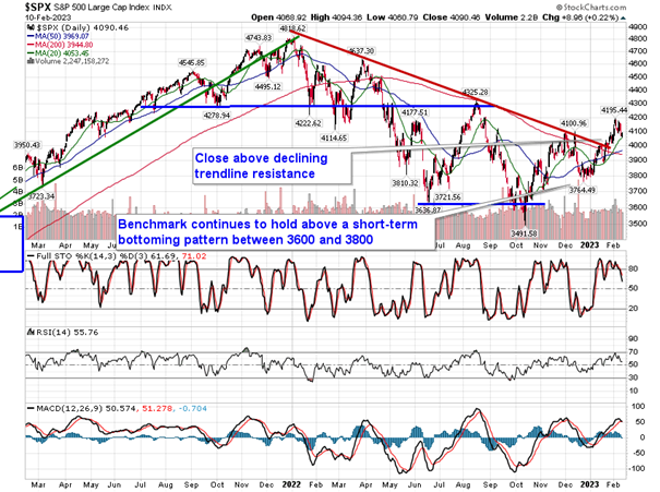 Stocks closed mixed to end the trading week as investors continue to consolidate the gains of the past month and position ahead of the release of the next inflation gauge by way of the report on consumer prices on Tuesday.  The S&P 500 Index closed with a gain of just over two-tenths of one percent, supported by strength in energy and a rebound in utilities.  The benchmark remains below the important pivot point at 4100, representing horizontal resistance at the December highs, but support at the cloud of major moving averages below is starting to be realized with Friday’s test of the rising 20-day moving average. The 50, 100, 150, and 200-day moving averages remain predominantly within a range between 3900 and 4000, presenting a massive range of support that is able to catch this market should this week’s pullback continue through the end of the month.  The zone also aligns with rising trendline support that stems from the October low, presenting a hurdle that is attempting to define the path of the market for the remainder of the year.  For now, while we remain around this confluence of support, still battling with the 4100 level of resistance derived by the December highs, a neutral view of the broad market benchmark remains warranted, but this does not prevent us from taking directional bets in various segments that are performing well (eg. energy), while avoiding exposure to those segments that are acting as a drag to broad equity market performance (see our weekly chart books for further insight and ideas).