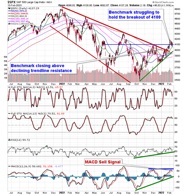 Stocks closed higher to start the week as investors brace for the latest read of inflationary pressures scheduled to be released on Tuesday by way of the Consumer Price Index (CPI).  The S&P 500 Index ended with a gain of 1.14%, continuing to bounce from the rising 20-day moving average that was tested as support on Friday.  The consolidation around the 4100 pivot point continues, providing enough food for thought to the bulls and the bears to maintain their conviction into the important economic data points ahead.  Below the rising 20-day moving average, a cloud of moving averages between 3900 and 4000 are in a position to support a retracement, as is normal from a seasonal perspective through the remainder of February.  MACD triggered a fresh sell signal on Friday with a cross below its signal line, charting a divergence versus price, a signal of waning buying demand.  MACD has yet to achieve a higher-high since August, but a lower-low has similarly been absent, conducive to this neutral state that the benchmark remains.