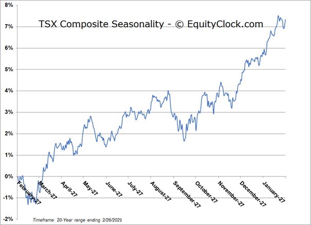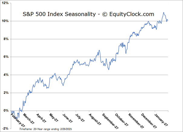 Stocks faltered in the final session of the trading week as an often relied upon gauge of inflation by the US Fed showed that pricing pressures reasserted themselves at the start of this year. The S&P 500 Index ended with a loss of 1.05%, closing below its rising 50-day moving average and reaching down to recently broken resistance at its 200-day. As has been highlighted in recent reports, a confluence of support presented by major moving averages in the range of 3900 to 4000 remains in a position to backstop this market and it would take a move below this zone to suggest something increasingly dire for the direction of stocks in the near-term. Momentum indicators remain on a sell signal following the bearish crossover of MACD and its signal line two weeks ago. The market continues to show a lot of respect to seasonal norms and the present period of average weakness typically finds a low around the first half of March, which we are now just days away from.Until then, respect the pullback and be on the lookout for opportunities to take on more risk in portfolios for the spring ramp in equity prices that is normal starting from around the middle of March and peaking around the middle of April.