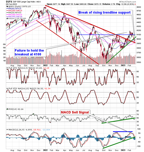Stocks drifted lower in the final session of February as ongoing dollar strength burdened risk assets. The S&P 500 Index closed lower by three-tenths of one percent, slipping back below its rising 50-day moving average. Consecutive long upper and lower-wick candlesticks charted in recent days highlights the tenuous state of the benchmark heading into the new month, a period that investors will be seeking clarity as to the Fed’s next actions.A confluence of support presented by major moving remains in a position to backstop the market in the near-term between 3900 and 4000, a break of which would entertain a much more bearish view of the market, away from the Neutral bias that we continue to maintain. Momentum sell signals remain intact following the bearish MACD crossover charted two and a half weeks ago and the short-term trend is negative, as depicted by the declining 20-day moving average.
