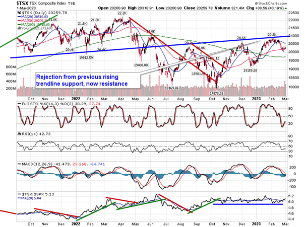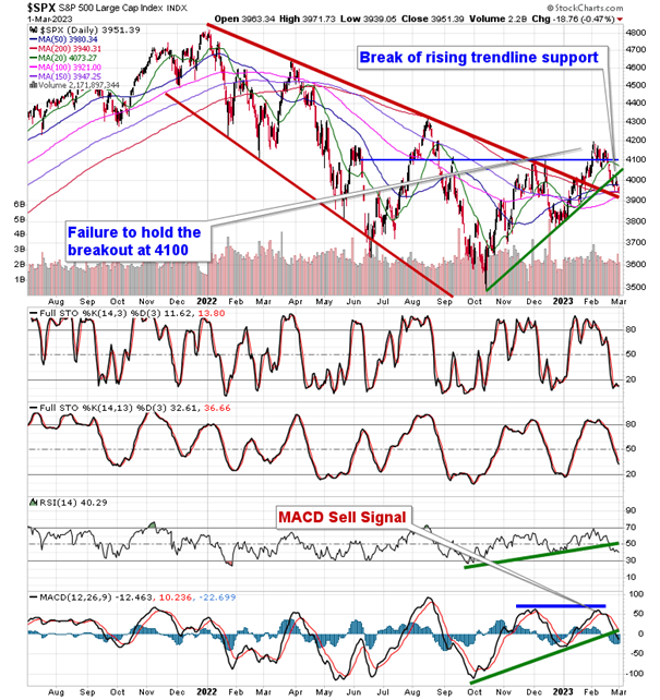 Stocks struggled in the first session of March as the cost of borrowing jumped higher amidst an ongoing repricing in the bond market following stronger than expected economic datapoints for the month of January.  The S&P 500 Index ended lower by around half of one percent, slipping back below the 50-day moving average and reaching towards the still declining 200-day moving average.  So far, this long-term variable hurdle that was broken as resistance in the middle of January is remaining unviolated as a point of potential support and, if this is sustained, it would send a strong signal to the market.  Traditionally, it is well known on Wall Street that nothing good happens below the 200-day moving average and if you can merely avoid periods when price is below this threshold, you can perform very well in investment portfolios.  Confirmation of support at this long-term hurdle would start to pull up on the negative slope and help to solidify a backstop to this market for a sustainable trade higher in prices into the spring.  For now, the trend of the market in the short-term, as gauged by the declining 20-day moving average, is still negative and momentum indicators remain on a sell signal, as triggered by the bearish MACD crossover two and a half weeks ago.  We’ll be watching the reaction of the market closely around these major moving averages and, until then, a neutral bias remains warranted.