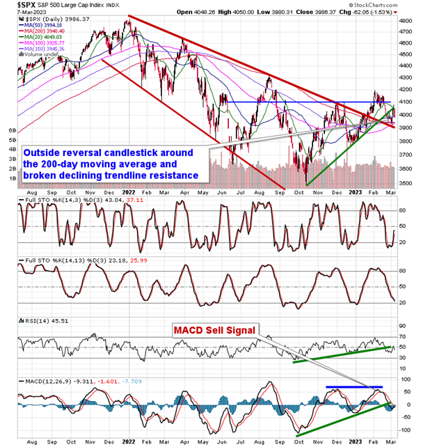 Stocks sold off sharply on Tuesday as comments from Fed Chair Jerome Powell indicated that interest rates are likely to be higher than previously anticipated given the recent string of stronger than expected economic data.  The S&P 500 Index fell by 1.53%, taking a big bite out of last week’s gain and closing back below the rising 50-day moving average at 3994.  Resistance at the declining 20-day moving average at 4048 was confirmed in the previous session and the benchmark seems poised to take another swing at implied support around the still declining 200-day moving average at 3940.  A confluence of support presented by major moving averages in the range of 3900 to 4000 remains in a position to backstop this market and, until proven otherwise, there is still greater signs of support to this market than there is resistance.  The rebound in momentum indicators from the previous session has, quite obviously, taken a pause following Tuesday’s downturn, but, over a longer-term timeframe, a neutral view has remained warranted.