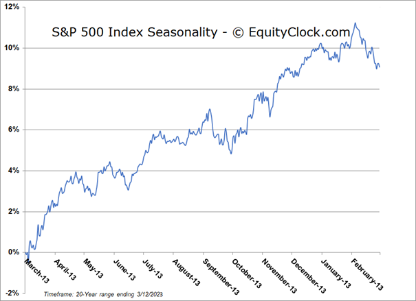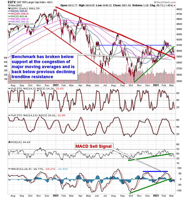 Stocks continued their selloff on Friday as fears of financial contagion ballooned amidst the fallout from the collapse of SVB Financial.  The S&P 500 Index closed down by 1.45%, moving definitively below support presented by major moving averages in the range between 3900 and 4000 and retaking levels below previous declining trendline resistance that currently sits at 3880.  In a striking shift from the observation that we made just one week ago, this market is no longer being supported as we head towards what is traditionally a strong time of year for stocks through March and April.  Momentum indicators are re-adopting characteristics of a bearish trend below their middle lines and short-term levels of resistance, such as around 4100, have become defined.  As we have been explaining in our outlooks to subscribers over the past week, even before this headline shock attributed to the SVB Financial collapse, the risks that the financial sector is portraying for the broader market are significant and caution is warranted given the leading nature of banks for broader equity market performance.  The large-cap benchmark finds itself back below its 200-day moving average, which, as explained in our last outlook, nothing good happens while prices are below.  The concerning technical and fundamental backdrop must be weighed against what is typically a strong timeframe for stocks through the month of April, but when we have something tangible in hand to suggest something abnormal is occurring, whether it be a pandemic closure of the economy or an elevation of systematic risks in the banking sector, we have to abandon traditional seasonal biases.