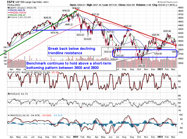 Stocks stabilized on Tuesday in a reflux reaction following the sharp downdraft of recent sessions amidst concerns of the onset of a banking crisis. The S&P 500 Index closed higher by 1.68%, remaining below major moving averages. At the highs of the session, the large-cap benchmark reached back to and tested recently broken support at the declining 200-day moving average, a test that had investors selling into the critical long-term hurdle. The long upper-wick candlestick below this hurdle and what is the confluence of major moving averages in the range of 3900 to 4000 appears highly threatening and suggests that the bears have control of the tape. Lower values for the benchmark is the obvious conclusion. Momentum indicators continue to take positions in the lower half of their ranges, which is characteristic of a bearish trend. The critical hurdle to watch on the downside is the December low at 3764; below this, the intermediate trend of higher-highs and higher-lows would no longer be intact, potentially unleashing the next wave of selling pressures as investors seek to contain risk within portfolios.