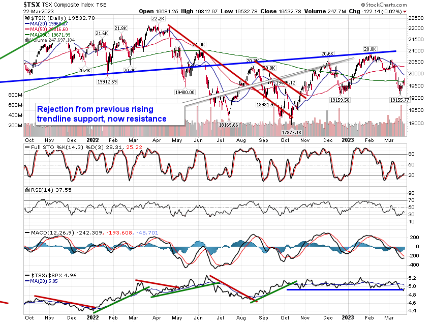 Stocks and bond yields dropped on Wednesday as the market reacted to the latest FOMC meeting announcement. The S&P 500 Index closed down by 1.65%, showing a sharp negative reaction around now intermediate resistance at the 50-day moving average. The confluence of major moving averages, including the 20, 50, and 200-day, in the range between 3900 and 4000 remains a formidable barrier preventing the equity benchmark from achieving the strength that is typical of this period heading into the start of spring; until the hurdle is broken, it has to be expected that it will cap the near-term trajectory until the uncertainty in the market alleviates. The December low at 3764 remains a critical level to watch as a violation of this hurdle would start to imply negative intermediate implications beyond the short-term burden that has been experienced since the start of February. In a recessionary economic framework, a break below the December low and the rising 200-week moving average at 3736 would be the base case and it is certainly not the environment that we want to have a positive correlation to risk assets within investment portfolios.