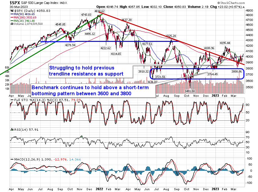 Stocks continued to push higher into the end of the quarter as investment managers pad portfolios with many of this quarters winners in the Technology sector.  The S&P 500 Index posted a gain of just less than six-tenths of one percent, charting a rather indecisive doji candlestick above resistance at the 50-day moving average.  The benchmark is making incremental progress above the recently highlighted confluence of major moving averages between 3900 and 4000, but the bulls are clearly showing hesitation running away with the ball with the fundamental uncertainties that persist.  The end of the first quarter notoriously has an upside bias for stocks, a phenomenon that leads into another strong month in April, but our concern is how stocks will perform when they do not have these seasonal tailwinds behind them as we get later into April and into the month of May.  Keep tabs on our weekly chart books for segments that warrant buying as constituents on our Accumulate list continue to perform very well.