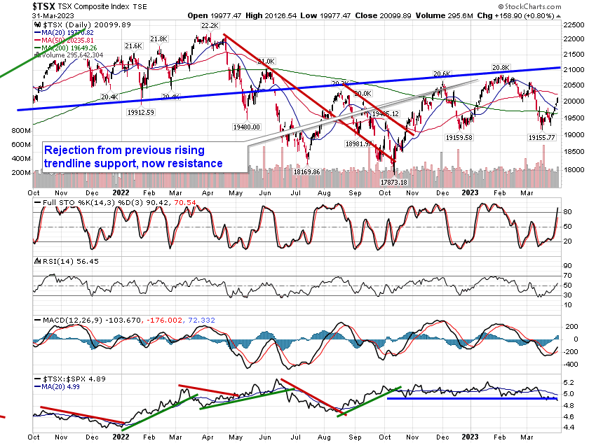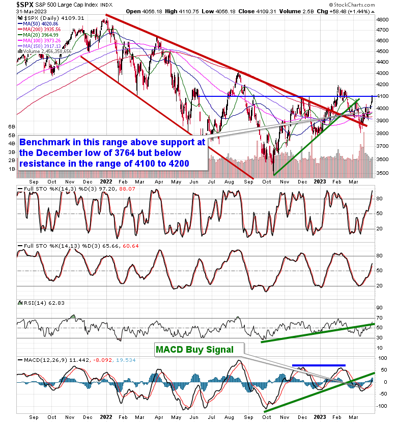 Stocks rallied to close out the final session of the quarter as investors brush of concerns from the past month pertaining to the banking turmoil and economic degradation and continue to turn to those segments that have been in a position to benefit from the peak in the cost of borrowing.  The S&P 500 Index closed with a gain of 1.44%, ending at the high of the month and violating the previously highlighted short-term path of lower-lows and lower-highs stemming from the February peak.  The benchmark has moved beyond the confluence of major moving averages in the range of 3900 to 4000 and now finds itself into the horizontal range of resistance between 4100 and 4200 that has capped upside potential for months.  Still, despite this barrier overhead, the benchmark remains in this intermediate rising trend of higher-highs and higher-lows stemming from the October lows given that price has managed to hold levels above the December lows.  As has been highlighted, this has been sufficient keep the potential of strength that is normal for March and April alive, despite a fundamental backdrop that has been trying to convince us of an alternate direction.  Our Accumulate candidates in our weekly chartbooks continue to appropriately target the strength in the market that has been realized through the past month, primarily in the technology sector, but the performance of the past week may require another look at those that are on our list to Avoid given signs of support below some of the segments that have been/are in downtrends are now showing signs of support (eg. Utilities and REITs).  Stay tuned to our chart books update on Monday for the highlights.