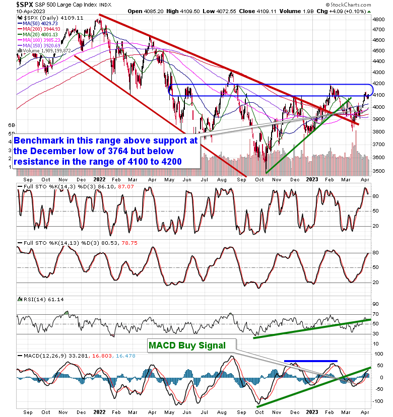Stocks closed fairly mixed on Monday as investors received their first opportunity to react to March’s payroll report that was released on Friday. The S&P 500 Index added one-tenth of one percent, continuing to show hesitation around the band of resistance between 4100 and 4200. Momentum indicators continue to show early signs of upside exhaustion with the MACD histogram continuing to decline now that the technical indicator is converging on its signal line. The band of major moving averages in the range of 3900 and 4000 is in a position of near-term support, but the benchmark is certainly not in a position yet to suggest that these moving averages are set to carry the benchmark higher over an intermediate to long-term basis.